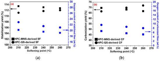 Figure 8 shows the yield and oxygen contents of SFs and CFs prepared from HPC-MNS and HPC-QS derived pitch fibers. It is noticed that the stabilization yield and carbonization yield of HPC-MNS-derived fibers decreased with increasing SP of their pitches. In contrast, those of HPC-QS-derived fibers increased with increasing SP of their pitches. However, the oxygen contents of HPC-MNS-derived fibers and HPC-QS-derived fibers decreased with increasing SP of their pitches due to their higher aromaticity of pitch precursors. Moreover, whether stabilized fibers or carbonized fibers, the oxygen contents of HPC-QS-derived fibers was higher than those of HPC-MNS-derived fibers even the oxygen contents of HPC-QS-derived pitches was lower than those of HPC-MNS-derived pitches. It reveals that the HPC-QS-derived pitch fibers are easier to be oxidized than the HPC-MNS-derived pitch fibers due to the HPC-QS-derived pitches containing lower fa and Mw.