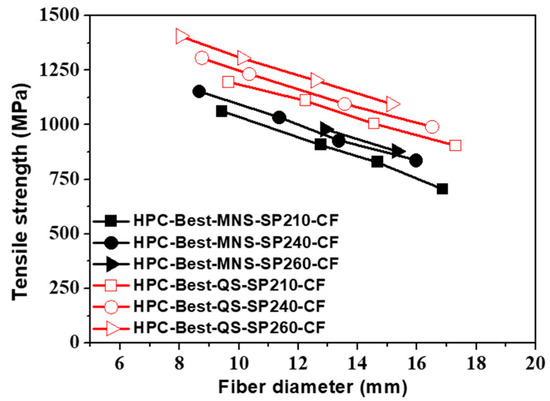 The tensile strengths of the CFs obtained from HPC-MNS and HPC-QS-derived pitches was shown in Figure 10. It is noticed that the tensile strengths of CFs increased as the higher SP of pitches due to the higher aromaticity of pitches with higher SP. Moreover, the CFs prepared from HPC-QS derived pitches had higher tensile strengths than the CFs prepared from HPC-MNS derived pitches. This was due to the HPC-QS fractions had been successfully modified by hydrogenation with THQ to decrease the oxygen content and adjust the molecular structure of HPC, the resulting HPC-QS derived pitch showed more homogeneous melted state and excellent spinnability even with higher SP. Therefore, the tensile strength of CFs obtained from HPC-QS-SP260 derived pitch was up to 1350 MPa, which was much higher than that of the commercial ones of 600–800 MPa [20].