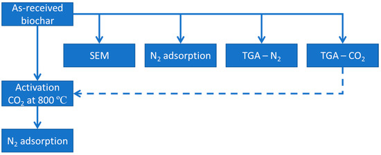 The runs in carbon dioxide were used to simulate activation and to measure kinetic parameters of the oxidation reaction by CO2. They included similar heating ramps (10 °C/min) and isothermal segments at 600, 700, and 800 °C, using fresh samples each time. This exercise showed that each char has specific oxidation kinetics. This information was used for estimating the length of activation treatments needed to achieve about 30–35% weight loss at preselected temperatures. The simplified sequence of experiments, from initial biochar characterization, through physical activation, and to the subsequent characterization of activated carbons, is presented in Figure 1.
