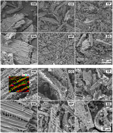 SEM images in Figure 2 show representative fields of view of charred samples (prior to activation) at 100× and 500× magnification. To show both topographical information contained by SE signals, and atomic number contrast from BSE signals, each image in Figure 2 is a digital, weighted summation (70% BSE plus 30% SE) of these two simultaneously acquired signals. This imaging technique shows the size and morphology of the char particles and the presence of phytoliths in the pyrolyzed biomass. Phytoliths are minute mineral deposits (e.g., Si, Ca, P based) in plant tissues due to the uptake of minerals during their life cycles. Having a higher average atomic number than the surrounding pyrolyzed carbon phases, these phytoliths appear as bright features. An example of the local distribution of Ca, O, and Si is shown by the energy dispersive X-ray spectroscopy (EDS) color image overlapped on the HW micrograph at 500× magnification.