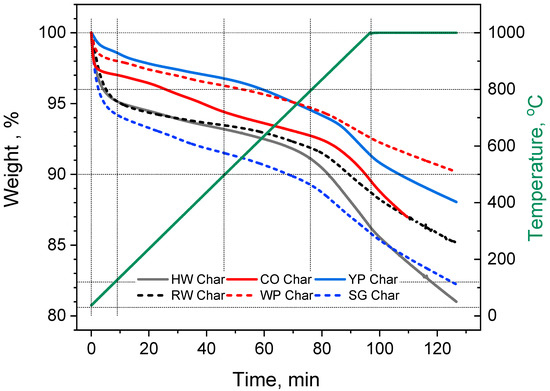 The chars obtained from fast pyrolysis at ~1100 °C still contain thermolabile components, because their short exposure time (<5 min) did not allow complete decomposition of cellulose, hemicellulose, and lignin. Moreover, since fast pyrolysis was not done in an inert atmosphere, the formation of oxygenated surface groups cannot be excluded. Before proceeding to physical activation in CO2, it was necessary to survey the thermal behavior in an inert gas (nitrogen) and to quantify weight losses caused by thermolysis of remnant lignocellulose components and surface oxides.