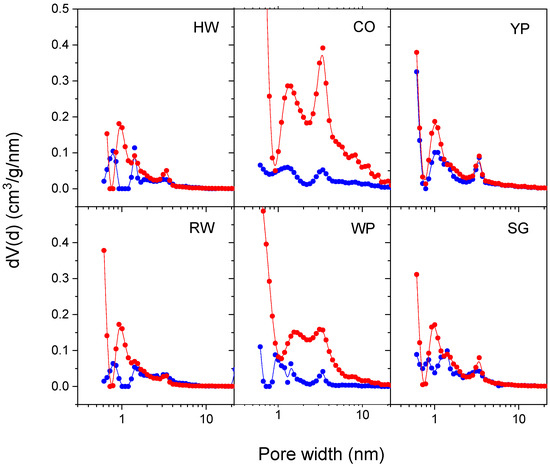 Pore size distributions for char materials (blue symbols) and activated carbons obtained by physical activation at 800 °C (red symbols).