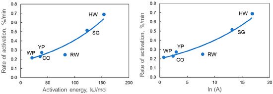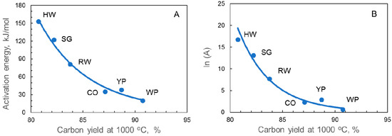 The chars have very different kinetic response during oxidation by CO2. Data in Table 2 show a large variation of pre-exponential factors and apparent activation energies. Figure 4 shows a linear correlation between ln(A) and Eact for all chars studied. This proportional variation of ln(A) and Eact in a class of similar reactions is known in the chemical kinetics literature as the compensation effect [26,27]. Although sensitive to error propagation (since the error in Eact is reflected in ln(A)), linear relationships between ln(A) and Eact were typically found for reactions that follow a common mechanism, including carbon oxidation reactions—catalyzed or not [28,29]—and cellulose pyrolysis [30]. One possible explanation of the compensation effect is based on the transition state theory of chemical reactions, according to which the energy levels and the entropy of the activated complex intermediary in the mechanism of carbon oxidation should be correlated [27].