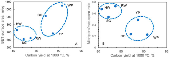 Figure 9A,B illustrate these conclusions. They compare BET values of activated carbons and the corresponding micropore/mesopore volumes ratios against the final carbon yield at 1000 °C in nitrogen (Figure 3). The six activated carbons form two groups. Those chars with high carbon yield (YP, CO, WP) generate activated carbons with high BET surface area and more mesopores in their total porosity. Indeed, robust chars with slow activation rates have spent longer times in the activation step and develop larger pores and higher BET areas. Less robust chars, with low carbon yield in dry nitrogen (HW, RW, SG) have faster reaction rates during activation, which leads to primary development of micropores but limits the growth of BET surface area. A paradoxical situation is observed: in the group of activated carbon studied here, large surface area carbons are mostly mesoporous, while microporous carbons have quite low surface area. This contrasts with the known trends observed during physical activation of any given char, where initial development of micropores expands BET area, and further collapse of micropores into mesopores drops it. Evidently, comparing activated carbons obtained from different charred sources is not expected to reproduce familiar trends encountered in activation of uniquely sourced chars.