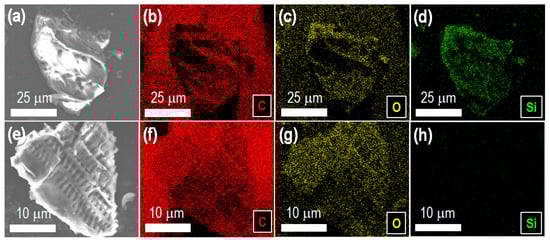 Results obtained from SEM/EDX. (a) SEM image of RHC, and elemental mapping (b) carbon, (c) oxygen and (d) silicon, and (e) SEM image of RHC_NaOH, and elemental mapping (f) carbon, (g) oxygen, and (h) silicon.