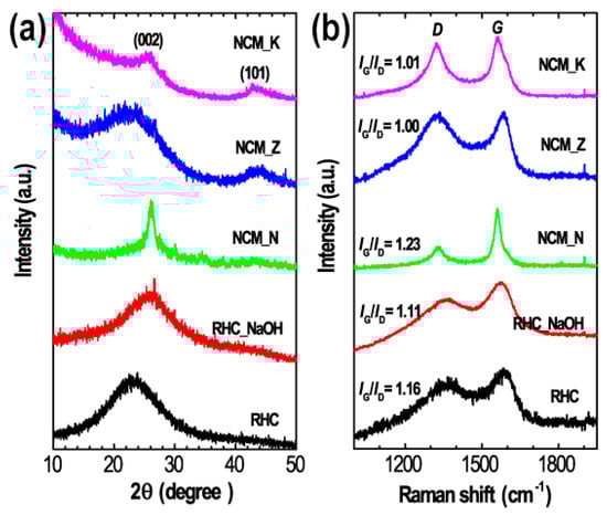 Powder X-ray diffraction patterns showed amorphous carbon structure. Two broad pXRD peaks (Figure 4a) observed for the NCM_Z and NCM_K samples at diffraction angles, 2θ ~25 and 43 degree represent typical features of amorphous carbons. These peaks corresponded to the (002) and (101) planes of micrographitic clusters formed during activation process at elevated temperatures [59,60,61]. Due to low processing temperature, in RHC and RHC_NaOH samples, ordered graphitic layers were not fully developed, and as a result pXRD peaks corresponding to (101) plane are absent. On the other hand, a sharp diffraction peak appeared at 2θ ~26 degrees for the NCM_N sample indicated the formation of highly graphitic carbon clusters, which is in agreement with the previous report that NaOH activation at high temperature leads to perfection in the crystalline graphitic structure [62].