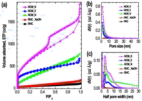 Figure 5 shows nitrogen adsorption-desorption isotherms, and the pore size distributions obtained by Barrett-Joyner-Halenda (BJH) and density functional theory (DFT). As it can be seen, nitrogen sorption isotherm is very much different depending on the sample indicating that the activating agent plays an important role on the surface area and pore volume of the prepared NCMs. Nitrogen adsorption capacity of RHC and RHC_NaOH before chemical activation is very low, which indicates the low porosity development in these sample as revealed by SEM observation. However, after chemical activation, nitrogen adsorption of the rice husk derived NCMs is enhanced drastically and the materials displayed mixed Type-I/Type-IV adsorption isotherms [64,66]. Significant increase of nitrogen adsorption at lower relative pressure with a hysteresis loop at higher relative pressures (Figure 5a: NCM_K) is a typical sorption isotherm of porous materials containing both micro- and mesopore structures. High nitrogen adsorption at lower relative pressure is well-known phenomena of micropore filling, whereas capillary condensation occurring in the mesopores is responsible for the hysteresis loop. The pore size distribution curves shown in Figure 5b (BJH method) and Figure 5c (DFT method) further confirm the presence of meso- and microporous structure of the NCMs. From the adsorption isotherms Brunauer-Emmett-Teller (BET), surface areas were ca. 885 m2/g (NCM_N), 1264 m2/g (NCM_Z), and 2342 m2/g (NCM_K). The BET surface areas of pre-carbonized samples before activation were very poor and were ca. 156 m2/g (RHC) and 214 m2/g (RHC_NaOH). Similarly, total pore volumes of the prepared NCMs were ca. 1.18 cm3/g (NCM_N), 1.99 cm3/g (NCM_Z) and 2.94 cm3/g (NCM_K), while that of non-activated samples were ca. 0.26 cm3/g (RHC) and 0.46 cm3/g (RHC_NaOH). The average pore size of chemically activated NCMs were ca. 5.37 nm (NCM_N), 3.26 nm (NCM_Z) and 5.0 nm (NCM_K). It is interesting to note that KOH activated sample displayed excellent surface textural properties BET surface area (2342 m2/g), which is much higher than most of the commercially available activated carbons, whose surface area were found in the range of 1000–1200 m2/g [64,67].