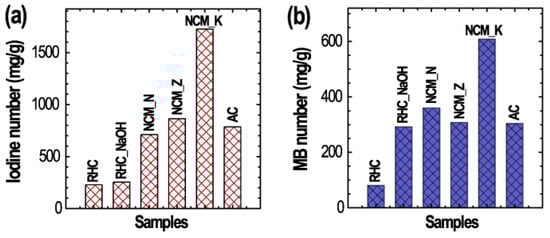 Results obtained from iodine and methylene blue adsorption: (a) Iodine numbers of RHC, RHC_NaOH, NCM_N, NCM_Z, and NCM_K, and (b) Corresponding methylene blue (MB) values.