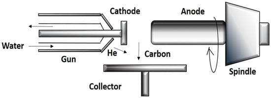 Moreover, large-scale synthesis is achieved by plasma rotating arc discharge (Figure 5). In this technique, a plasma rotating electrode process is involved, to solve the problem of the non-uniform cathode surface and the co-existence of impurities with the CNTs in the conventional arc discharge technique. CNTs are synthesized by the rotation of the graphite rod with a high velocity. Centrifugal force is produced by rotation, which in turn creates turbulence and causes an acceleration of carbon vapor that is perpendicular to the anode. The carbon vapor does not condense at the surface of cathode, but is collected on the graphite collector that is located at the boundary of the plasma. The collector becomes closer to the plasma as the speed of rotation increases, and the yield of CNTs is also increased [26].
