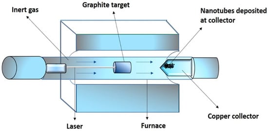 The laser ablation technique and the arc discharge method are similar in principles and mechanisms; however, they are different by the input energy sources. In the laser ablation method, the required energy is provided by a laser. Figure 6 shows the schematic structure of an experimental setup. A tube made up of a quartz-containing graphite block is heated in a furnace at 1200 °C, using a high-power laser in the presence of metal particles as catalysts [25]. A stream of argon is maintained during the course of the reaction. The graphite within the quartz is vaporized by a laser. Argon carries away the vaporized carbon, which condenses downstream onto the cooler walls of the quartz. SWCNTs and metallic particles are present in this condensation. According to studies, the laser power can influence the diameter of the CNTs. The diameter of the tube becomes thinner as the laser pulse power is increased [30]. Other studies reported that ultrafast laser pluses are of great potential, and are capable to produce larger quantities of SWCNTs [31]. The SWCNTs produced by this method are of high purity and quality. The position where the carbon atom starts to condense should be set up as a curved sheet of graphene with a metal catalyst atom nearby for the proper fabrication of the condensed nanotubes. When carbon atoms begin to assign for the formation of rings, the proper electronegative properties of the metallic atom prevent the open edge from closing [25]. The main advantages of this technique include relatively low metallic impurities, and a relatively high yield, due to the vaporization tendency of the metallic atoms from the end of the tube, once it is closed. The key drawback of this technique is that the synthesized nanotubes may not be regularly straight, and have some degree of branching. Furthermore, this procedure involves graphite rods of high purity, and requires high powers of lasers, and the amount of CNTs produced are not as great as in the arc-discharge technique.