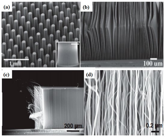 (a) SEM micrograph of cylindrical pillars of SWCNTs; (b) SEM images of 10 μm thick SWCNT sheets. Reproduced with permission from [73]. Copyright AAAS, 2004. (c,d) super-aligned MWNT array with different magnifications. Reproduced with permission from [84]. Copyright Elsevier, 2009.