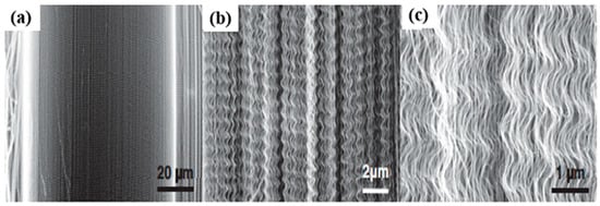 SEM images of a MWNT array with wavy structures at various magnifications (a–c). Reproduced with permission from [84]. Copyright Elsevier, 2009.