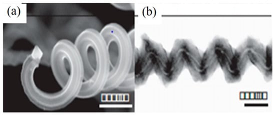 SEM image of helically coiled CNTs (a) Tip of a coil. The scale bar is 600 nm; (b) TEM image of two tubules, forming a coil with different diameters, but the similar pitch, and a small alteration in phase. The scale bar is 100 nm. Reproduced with permission from [84]. Copyright Elsevier, 2009.