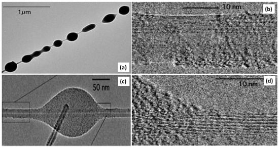 (a) TEM image of a MWNT with many beads; (c) TEM image of a small, elongated bead on MWCNT of 15 layers; (b,d) High-resolution TEM images of the beads. Reproduced with permission from [100]. Copyright AAAS, 2005.