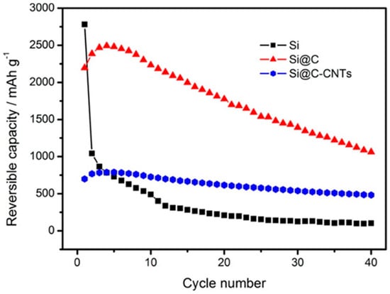 Figure 11 indicates that silicon (Si) electrode shows poor cycling performance after 40 cycles (100 mAh g−1) (first cycle reversible capacity of 2780 mAh g−1). The carbon coated Si (Si@C) reveals significantly enhanced cycling stability. This stability is due to the homogenous layer of carbon on the Si nanoparticles that controls the volumetric changes and enhances the conductivity, resulting in capacity retention of 48% after 40 cycles. For carbon-coated Si-CNT composite (Si@C-CNTs), a slight improvement of reversible capacity is detected during the first five cycles and subsequently began declining. Among all of the three anodes, the Si@C–CNTs anode demonstrates the highest cycling stability, with a 70% capacity retention after 40 cycles [137].