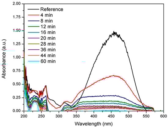 UV-vis spectra showing methyl orange degradation using MWCNTs/Pd nanostructured material. Reproduced with permission from [158]. Copyright Elsevier, 2016.