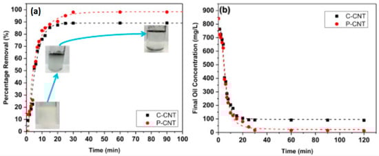 CNTs also play a key role in the removal of oil from water. This is an extremely significant area because of the enormous manufacturing rate of emulsified oil in water, which is one of the main toxins having a negative impact on the environment and on living organisms. High-quality CNT bundles synthesized by an injected vertical chemical vapor deposition (IV-CVD) reactor are used for the separation of oil. Two kinds of CNTs are used for oil separation from water; namely, produced CNTs (P-CNTs) and commercial CNTs (C-CNTs). An enhanced removal efficiency of approximately 97% is attained by using P–CNTs, as compared to 87% when using C–CNTs [166]. Figure 14 shows the effect of contact time on the percentage removal of oil, and the change in oil concentration in water with respect to time.
