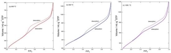 Figure 4 shows nitrogen gas adsorption/desorption isotherms recorded for the carbonized products prepared by heating at 800–1000 °C. These isotherms show a common feature typical for porous materials possessing mesopores (pore width: 2–50 nm); the isotherms show hysteresis related to condensation of gas occurring in the mesopores (IUPAC classification: Type IV) [
