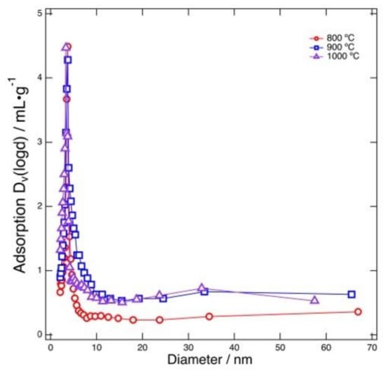 Figure 5 shows the results of BJH pore size distribution analysis performed for the products obtained by heating at 800–1000 °C followed by acid treatment. For all the samples, the major pore size was about 4 nm. Mesopores possessing this size were generated with the MgO template. As previously described, the crystallite size of the MgO precursor was 5–6 nm, as determined from the XRD results. Although this value is slightly larger than the size of the observed peak pore size (4 nm), considering the accuracy of the estimated crystallite size, the crystallite size was comparable to the typical mesopore size calculated using the BJH method. This indicates that the MgO template was trapped in the carbonized products in the form of nano-sized single crystals. In addition, the BJH mesopore size was comparable to that of previously reported MgO-templated carbons, indicating that the BJH mesopore size corresponds to the size of the MgO template. However, this size was different from the value reported for MgO-templated carbons derived from PVP/magnesium acetate, for which the reported pore size was smaller than 6 nm without any peaks [