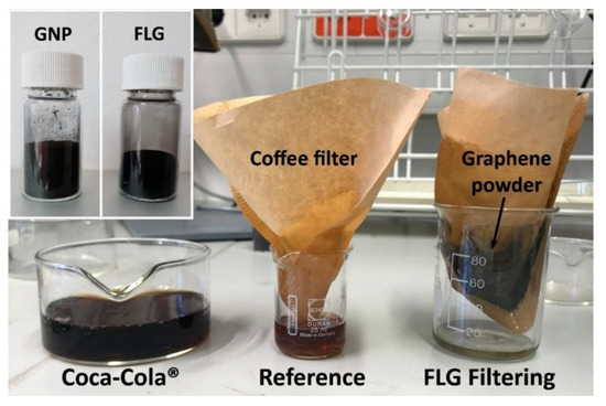 The purification experiments were performed by placing 1 g of graphene powder in a commercial coffee filter (Melitta Filtertüten Original 1 × 2) mounted on a glass flask. An empty coffee filter with no powder was used as a reference. This simple experimental setup is illustrated in Figure 1. Coca-Cola® was gradually poured on top of the filter, passed through the powder and the product was collected after a few minutes. Then, the filtered water was re-poured once again onto the filter and passed through the powder for a second filtering cycle. Digital pictures of the products were taken after both cycles. Commercial pH paper strips were dipped in the filtered liquids to observe changes in their pH value.