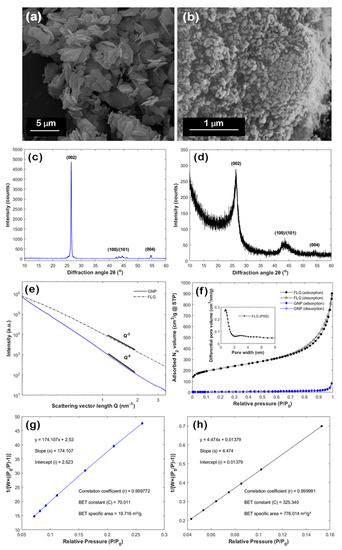 SEM images of the plasma-derived (a) GNP and (b) FLG powders, X-ray diffractograms for (c) GNP and (d) FLG, (e) SAXS curves, (f) N2 adsorption/desorption isotherms recorded at 77 K and linear multi-point BET plots for (g) GNP and (h) FLG.