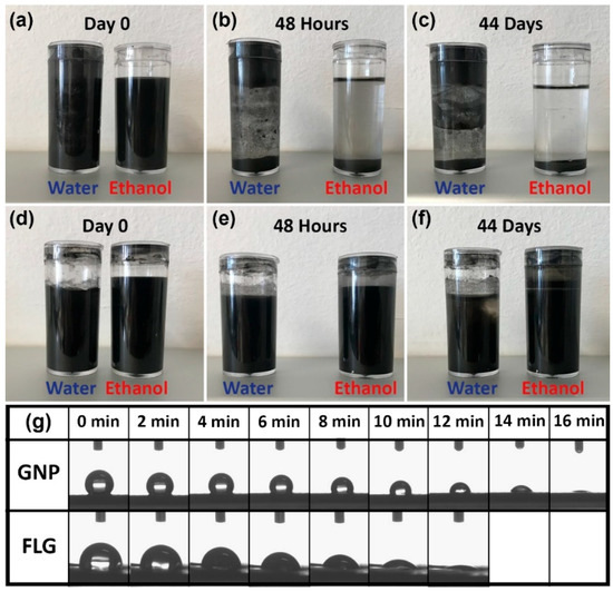 Dispersions of (a–c) GNP and (d–f) FLG powders with distilled water and ethanol directly after mixing, after 48 h and after 44 days, respectively; (g) digital pictures taken every 2 min for the water contact angle measurements of the as-prepared GNP and FLG thin films.