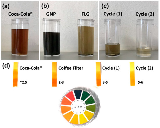 (a) Coca-Cola® filtered only with a coffee filter, (b) water-based liquids derived from Coca-Cola® upon filtration with GNP and FLG powders (first purification cycle), (c) water-based liquids derived from Coca-Cola® following two cycles of filtration with the FLG powder and (d) pictures of commercial pH paper strips; from left to right: pure Coca-Cola® (value extracted from literature [48]), Coca-Cola® filtered only with a coffee filter and Coca-Cola® filtered with FLG powder after one and two filtration cycles.