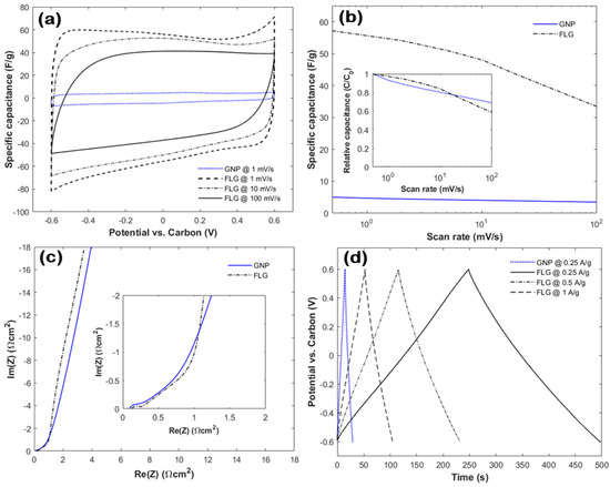 Electrochemical characterization of the FLG and GNP powders based on (a) CV curves with different scan rates (1, 10 and 100 mV/s), (b) rate handling tests between 0.5 and 100 mV/s based on CV, (c) Nyquist plots of the impedance spectra and (d) GCD curves for different specific currents (0.25, 0.5 and 1 A/g).