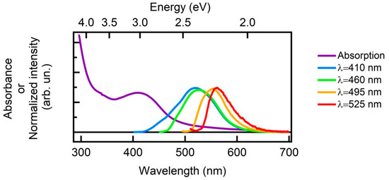 Absorption spectrum of CDs dissolved in glycerol (purple curve), normalized emission spectra of CDs in glycerol excited at 410 nm (blue curve), 460 nm (green curve), 495 nm (orange curve) and 525 nm (red curve).