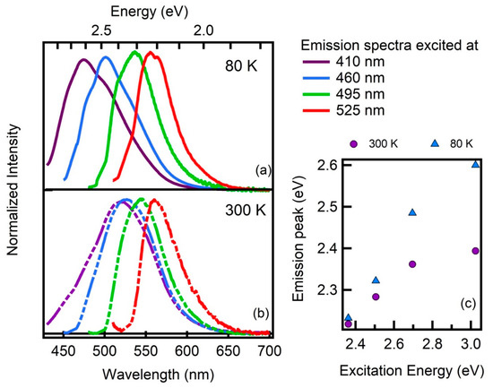 Normalized emission spectra of CDs in glycerol excited at 410 nm (purple curve), 460 nm (blue curve), 495 nm (green curve) and 525 nm (red curve) performed at 80 K (a) and 300 K (b); (c) emission peak as a function of excitation energy.