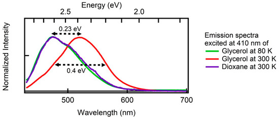 On the other hand, the data in Figure 2 and Figure 3 also reveal that the width of the emission bands in glycerol is almost unchanged from 300 K to 80 K. This indicates that the contribution of solvent-induced inhomogeneous broadening to the overall bandwidth is essentially negligible. This is particularly evident by the fact that the band remains quite broad (Figure 3) even in dioxane, where solvation effects should be almost zero. Using the equation σd−in = (ΔE × kBT)1/2, [28] one can estimate the amount of inhomogeneous broadening due to solvation. From the data in Figure 3, we can estimate ΔE as the shift between dioxane and glycerol at 300 K, that is approximately 0.23 eV. From that, we obtain σd−in = 0.077 eV, which is indeed much smaller than the overall width of about 0.4 eV observed in Figure 3.