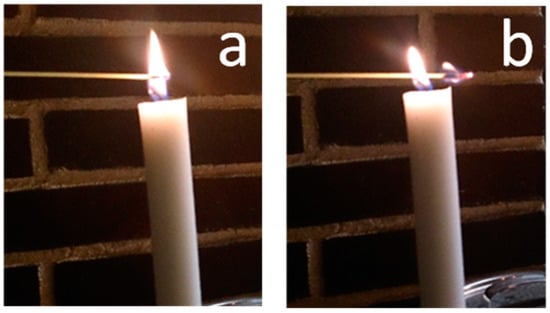 A stick of spaghetti being carbonized from combustion. (a) Stick of spaghetti being ignited in a candle flame; (b) the stick lies outside the flame and undergoes self-combustion.