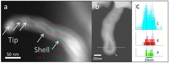 In an effort to further investigate the separation of phases between C on one hand and P and K on the other, we attempted an EDX line scan across the finger structure of Figure 5a. The line scanned is indicated in Figure 6b, and the signals for C, K and P are shown in Figure 6c. There was a movement of the finger during the 2 min EDX line scan of about 5 nm, indicated by the small arrow in Figure 6b. Nevertheless, from the elemental profiles seen in Figure 6c, we see that C is concentrated into two broad peaks, as expected for an outer shell, while K and P are found in two peaks having a smaller separation compared to the C peaks. The combination of this finding with the observation of sharp white contrast in Figure 6b means that K and P have probably formed as part of a thin inner shell, lining the inside of the carbon-rich outer shell.