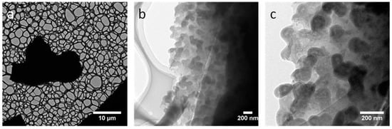 For Sample 1a, we found a variety of fragment types, shown in Figure 3. Finger-like protrusions were found that had broken away from the surface material (Figure 3a,b) and their dimensions were in line with the SEM observation. Some clustering of the fingers may have occurred during the preparation of the TEM sample. The fingers have a contorted shape, with a darker central string, typically narrower than 20 nm, which appears in some cases to bulge out at the tip of the finger. Some darker regions may be caused by fingers aligning parallel to the direction of the electron beam, or fingers overlapping each other. The darker contrast in the TEM image of the central string could be explained by higher local concentrations of atomic species that are heavier than carbon, e.g., alkali metals and phosphorous, which are known to be contained in biomass. The tip of a finger was usually slightly bulged (see Figure 2d), and of different contrast on the inside (see Figure 3a and Figure 4).