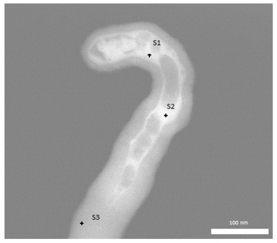 The observation that burning the “raw” material for Sample 1 lead to an enrichment of K and P in the central spine and tip regions of the fingers prompted us to examine a further sample (Sample 2), where the material had been additionally treated by boiling in salt water (3% mass), i.e., similar to the conditions for cooking pasta in domestic use. We cooked the pasta in the salt water for 15 min and let it dry on aluminum foil for 24 h. After combustion, Sample 2 again presented fingers, as can be seen in the dark field STEM image of Figure 9. Points are marked where EDX measurements were performed, with results reported in Table 2.