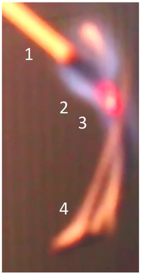 Figure 10 shows a single photograph of a freely burning stick, in which four different characteristic regions were observed at the same moment. In Region 1, there is pristine or unburnt material. In Region 2, combustion has just started. We see a flame region where off-gassing at the surface produced a blue flame with a weak slightly yellow tip, leaving behind a black surface. In Region 3, combustion has proceeded and the incandescent red-orange region shows high temperature pyrolysis (HTP) inside. Finally, in Region 4 we have the post-HTP region producing fumes or smoke (appearing yellow in the picture from light scattered by the fumes). The temperature of the HTP region was estimated to reach about 1000 °C, using the thermocouple in contact with the glowing surface. The entire reaction cycle was less than one-minute long.