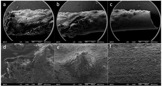 For more information on the structural changes for the burning processes, see Figure 11. It shows SEM images obtained at the different positions of a stick: (a) burnt; (b) transition regions, where surface has not yet blackened; and (c) partially heated (upper left) and virtually unaffected surface (lower right of the stick). Figure 11d shows the parts (with higher resolution) of a broken surface in the transition region, which is rich in internal macropores, indicating the considerable amounts of gas developed from the breakdown of polysaccharides; (e) volcanic structures with diameters around a few hundreds of micrometers, and (f) raw material corresponding to the transition and unburned upper left and lower right of Figure 11c, respectively.