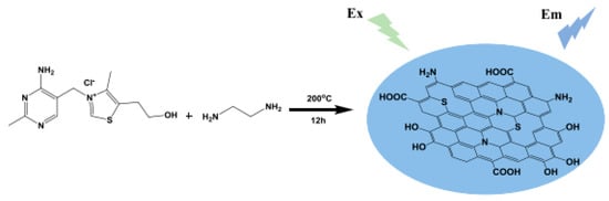 | Hydrothermal | Vitamin B1 (thiamine hydrochloride) and ethylenediamine | 12 h at 200 °C | Blue | 4.4 | Detection of Fe3+ ions (LOD of 177 nM) | [107] |