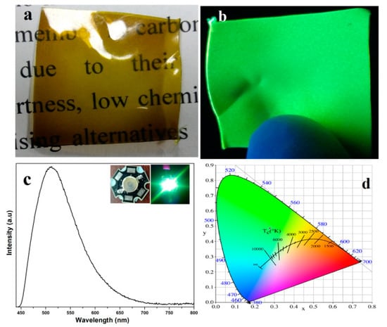 - Wang, F.; Chen, Y.; Liu, C.; Ma, D. White light-emitting devices based on carbon dots’ electroluminescence. Chem. Commun. 2011, 47, 3502. [Google Scholar] [CrossRef]