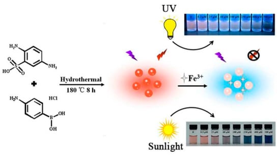 | Hydrothermal | 2-aminophenylboronic acid, 3-aminophenylboronic acid monohydrate, or 4-aminophenylboronic acid hydrochloride | 8 h at 160 °C | Blue | ~7 | Detection of p-nitrophenol (LOD of 0.2 μM) | [112,113] |