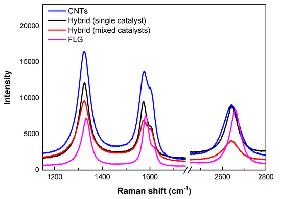 Raman spectra at room temperature of CNTs, FLG, and FLG-CNT hybrids produced from single and mixed catalysts (λexc = 532 nm).