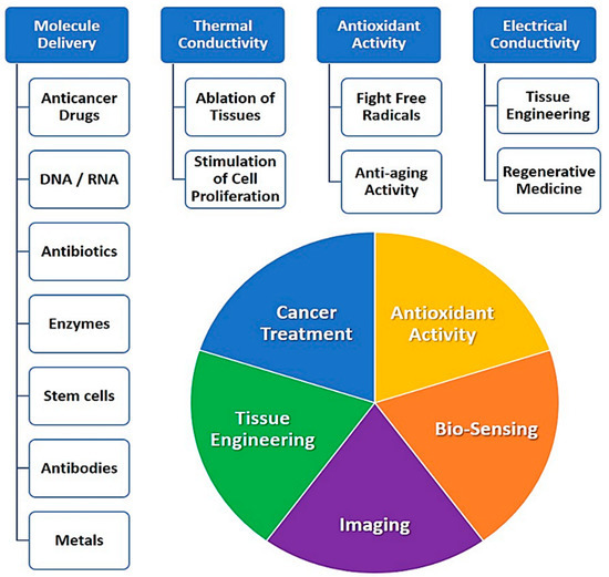 The distinctive characteristics of CNTs are a result of the source material (graphene) and nano-size. The size allows reaching remote sites of the organism, passing through cellular membranes and delivering uploaded biologically active substances. The main areas for possible biomedical applications of CNTs are bio-sensing, imaging, cancer treatment, drug and DNA delivery, tissue engineering, immunotherapy, regenerative medicine, and antibacterial therapy (Figure 1).