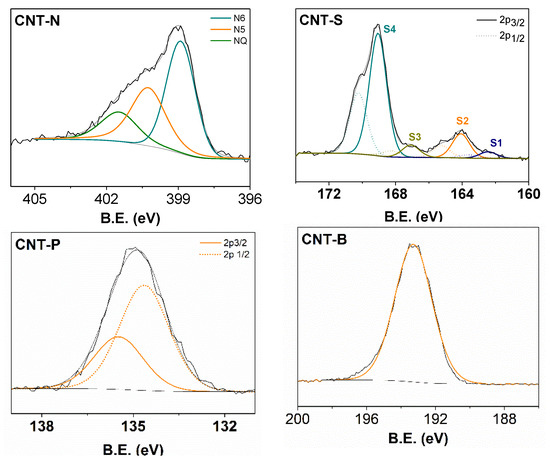 The nature of the N, S, P, and B-functionalities incorporated with the mechanothermal treatments was investigated using the corresponding spectra obtained by XPS (Figure 4). The asymmetric N1s spectrum of the sample CNT-N was deconvoluted in three peaks: quaternary nitrogen (NQ, B.E. = 401.4 ± 0.3 eV; 20%), pyrrole (N5, B.E. = 400.1 ± 0.2 eV, 35%), and pyridinic (N6, B.E. = 398.6 ± 0.3 eV; 45%) structures, which are typically formed in carbon samples prepared above 550 °C [58]. Assumptions regarding the N1s spectrum fitting may be found elsewhere [38]. The S2p spectrum recorded for sample CNT-S was deconvoluted assuming that each of the 4 components has a S 2p3/2 and 2p1/2 doublet separated by 1.18 eV and with an intensity ratio of 2:1. The fitted S 2p3/2 peaks were ascribed to Na2S2O3 (S1, B.E. = 162.4 eV), elemental S (S2, B.E. = 164.1 eV), Na2SO3 (S3, B.E. = 167.1 eV), and Na2SO4 (S4, B.E. = 169.1 eV) [59]. The weak S1 component suggests that a small amount of precursor was not decomposed; however, the presence of the other three components suggests that the thermal degradation of sodium thiosulfate led to the formation of Na2SO3 and S. In addition to the TGA results, the presence of the Na2SO4 species suggested that, even in the absence of oxygen during the thermal treatment, the sample became very reactive to oxygen, showing that some Na2SO3 may be converted into Na2SO4 [52,53]. The P 2p spectrum of sample CNT-P has also been deconvoluted considering the P 2p3/2 and 2p1/2 doublet separated by 0.84 eV, with an intensity ratio of 2:1. A single peak was found at 134.6 eV, which is commonly attributed to phosphorous in the form of metaphosphates () [59]. The absence of a peak corresponding to the binding energy at 133.2 eV (typical of phosphate, confirms that phosphate has suffered a thermal dehydration to metaphosphates, in agreement with the TGA results [54,55]. The B1s spectrum of the CNT-B sample shows a single peak at 193.0 eV, which is commonly assigned to boron oxide (B2O3). Since this sample was treated at 200 °C, and crystalline boron oxide has a melting point of 450 °C, the sample CNT-B should be a physical mixture of CNTs and B2O3. This also explains the significant decrease of the surface area of this sample (45 m2 g−1), since B2O3 may be occupying the free space between the tubes or even covering some of them.