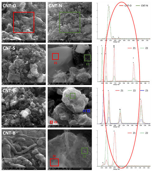 The surface morphology of the doped samples was assessed by SEM/EDS and compared with the pristine materials to confirm the enrichment of the carbon surface with heteroatoms. As can be seen in Figure 5, sample CNT-O displays highly entangled and twisted tubes. This entanglement was noticeably reduced after the ball-milling treatment, for all doped samples. Indeed, in previous work [46], it was observed (by TEM) that the ball-milling treatment is highly effective in disentangling and shortening the CNTs. Figure 5 shows that sample CNT-N presents a morphology similar to that of CNT-O, the main difference being the reduction in the entanglement. EDS analysis confirms the presence of N-groups on the surface of the CNTs (Figure 5). The other doped samples exhibit a heterogeneous morphology, with regions where the heteroatom compounds have been deposited on the surface, identified by the different zones (Zi). Sample CNT-P presents a more homogenous dispersion of the heteroatoms than CNT-S, but in both it is evident the existence of particles with planar faces suggest the presence of P and S in the form of metaphosphates (PO3−) and Na2SO3, respectively, since the EDS analysis reveals that the increase of each heteroatom is always accompanied by a corresponding increase in the amount of oxygen. These findings confirm the XPS and TGA results. Sample CNT-B presents a distinct morphology, in which the tubes seem to be in the form of dreadlocks. This observation could explain the low surface area of this sample (Table 1) due to the agglomeration of the tubes. The presence of boron in the form of boron oxide is confirmed in the surface of the nanotubes by the EDS analysis since oxygen is present in high amount when boron is identified.