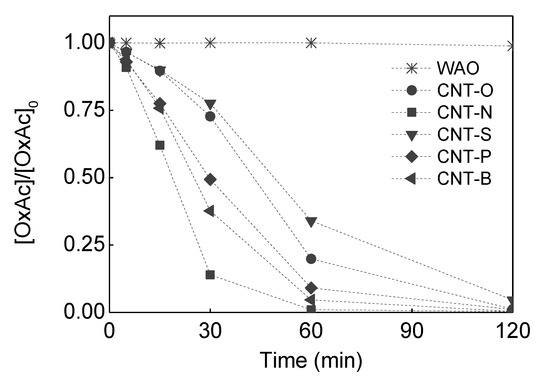 The carbon materials doped with different heteroatoms were selected for catalytic tests in the oxidation of oxalic acid by CWAO. The materials were chosen with the aim to clarify their potential use as metal-free catalysts in the degradation of organic compounds by CWAO. Moreover, catalyst evaluation was outlined with the ambition to clarify the more adequate properties of carbon materials in the selected application. Oxalic acid was selected as a model compound to evaluate the process efficiency. It is representative of short chain carboxylic acids, which are typical refractory compounds appearing as end-products in the advanced oxidation processes. Figure 6 shows that oxalic acid is poorly oxidized under temperature and pressure employed in the absence of a catalyst, while CNT materials show high catalytic performance, with almost complete degradation of the model compound after 120 min of reaction, regardless of the sample tested (pristine or doped).