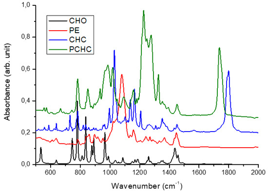 In a representative experiment, a stainless-steel autoclave with a nominal volume of 2 mL, equipped with a magnetic rod, a manometer, and a gas inlet/outlet, was charged with 0.5 mL (0.0049 mol) of cyclohexene oxide and 1 mol % of catalyst. The autoclave was equilibrated at 70 °C for 30 min. Then, the reaction was allowed to run during 20 h at constant CO2 pressure of 4 MPa. The crude reaction mixture was analyzed by the ATR-IR set-up described above in paragraph 2.2. The conversion and the selectivity towards the formation of the end-products reported in the tables below have been determined by ATR-IR. Indeed, as reported previously, ATR-IR spectroscopy is better adapted than 1H NMR to determine the selectivity in particular between the cyclic carbonate and the polycarbonate [17]. Nevertheless, we checked for a few samples that the conversions and yields determined by ATR-IR were in accordance with the NMR results. Figure 1 illustrates the ATR-IR spectra of CHO, CHC, PCHC, PE.