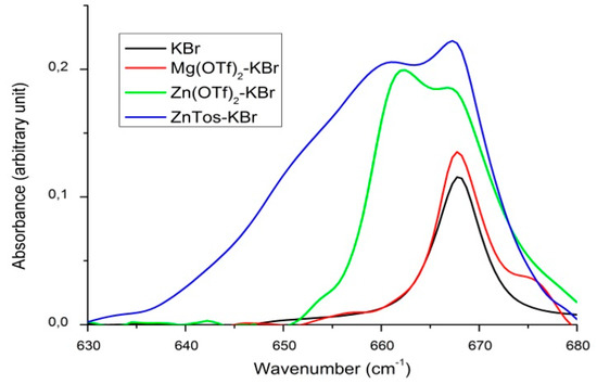 The spectrum of a KBr pellet under CO2 pressure at 4 MPa reported for comparison displays a single narrow band at 668 cm−1 that is associated to the degenerated bending mode of CO2, thus revealing that there is no specific interaction between KBr and CO2. The same conclusion can be done in the case of Mg(OTf)2-loaded KBr pellet. A different behavior is observed in the case of Zn(OTf)2 and ZnTos. Indeed, an additional component is observed at about 662 and 660 cm−1 for Zn(OTf)2 and ZnTos, respectively. Thus, from these observations, we can conclude that there is a specific interaction between CO2 and both Zn(OTf)2 and ZnTos. The higher shift, width, and intensity of the broad component observed for ZnTos can be interpreted as a signature of the stronger activation of CO2 by ZnTos.