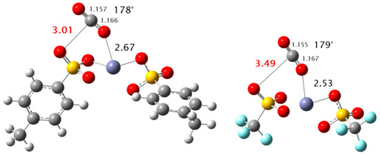 Optimized geometries (CAM-B3LYP/aug-cc-pVDZ) of the structures of the ZnTos-CO2 (left) and Zn(OTf)2-CO2 (right) complexes. Bond lengths of interest are displayed in Ångström (dashed lines). The intramolecular C–O distances and OCO angle of CO2 are also displayed.