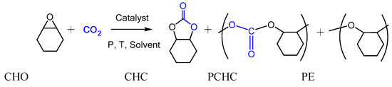 The CO2/cyclohexene oxide (CHO) coupling leading to various possible products: cyclic cyclohexene carbonate (CHC), poly(cyclohexene carbonate) (PCHC), and poly(cyclohexene ether) (PE).
