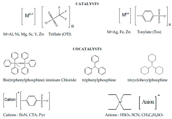Metal triflates complexes, Sc(OTf)3 (Sigma-Aldrich, St. Louis, MO, USA, 99%), Y(OTf)3 (Sigma-Aldrich, 98%), Ni(OTf)2 (Sigma-Aldrich, 96%), Mg(OTf)2 (Sigma-Aldrich, 97%), Al(OTf)3 (Sigma-Aldrich, 99%), and Zn(OTf)2 (Sigma-Aldrich, 98%), were used as received and stored under Argon. Organic cocatalysts, Bis(triphenylphosphine)iminium chloride (PPNCl, Sigma-Aldrich, 97%), Triphenylphosphine (P(Ph)3, AlfaAesar, Haverhil, MA, USA, 99%), Tricyclohexylphosphine (P(Cy)3, AlfaAesar, 96%), Tetraethylammonium hydrogensulfate (Et4NHSO4, Fluka, Charlotte, NC, USA, 99%), Tetraethylammonium thiocyanate (Et4NSCN, Fluka, 99%), Tetraethylammonium p-toluenesulfonate (Et4NTos, Fluka, 99%), Cetyltrimethylammonium p-toluenesulfonate (CTATos, Sigma-Aldrich, 99%), and Pyridinium p-toluenesulfonate (PyrTos, AlfaAesar, 98%), were used as received and stored under Argon. Metal tosylates complexes, Zincp-toluenesulfonate hydrate (ZnTos xH2O, AlfaAesar), Silver p-toluenesulfonate (AgTos, AlfaAesar, 98%), and Iron p-toluenesulfonate hexahydrate (FeTos 6H2O, Sigma-Aldrich), were stored under Argon. AgTos was used as received and anhydrous ZnTos and FeTos were obtained after drying for 1 h under vacuum at 160 °C using the protocol described in reference [67]. Carbon dioxide with a purity of 99.95% was purchased from Air Liquide and used as received.
